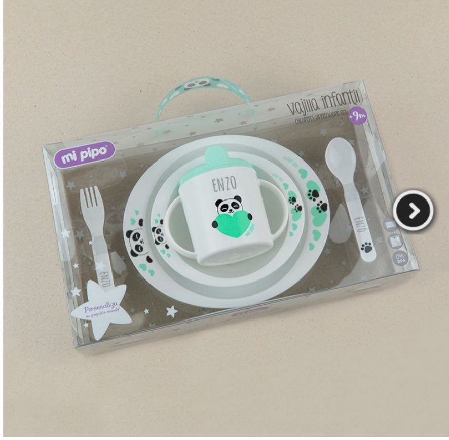 El nombre del bebé se graba en taza y cubiertos. Máximo 10 caracteres